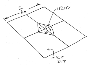 - ボールは自分のエリア内で必ずワンバウンドして、別のエリアに送られます。自分のエリア内でツーバウンド以上させたり、相手のエリアにボールが入らなかった場合、階層が1ランク下がります。
