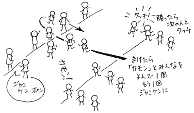 - 「ヨーイドン」で、先頭から一人ずつ目の前にいる関所の人の走っていき、ジャンケンします。