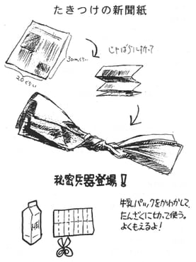 新聞紙は、テントのなかにひいたり、濡れた靴を乾かしたり、寒いときには、体にまいて寝たりと、さまざまな使い道があります。火をおこすときには、湿気を吸いやすいので、雨の日や晴れているときでも、地面やマキのうえに直接置いたりせずに、ビニール袋などに保存しておきます。