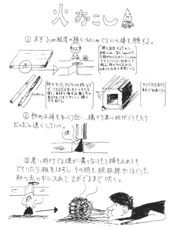 指の太さぐらいのあじさいの枝や、竹の棒を両手ではさみ、切り込みを入れた杉の板などに強く押しつけて、すばやく回転させることで火を起こす方法です。