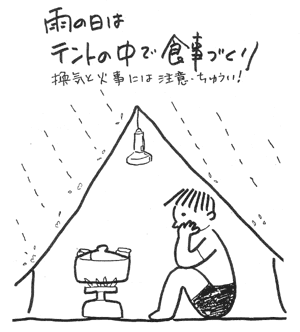 こうなるともう食事づくりどころでは、ありません。バンガローやテントのなかに非難して、雨の去るのを待つことになります。