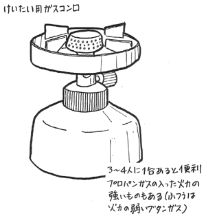 ハム、チーズ、ビスケットやクラッカー、缶詰類などがこういうときは、役に立ちます。こういうときのためにも生肉よりも加工してあるハムやベーコンのほうが役に立つのです。これに4~5人で一台の携帯用コンロがあれば、少しぐらい雨に閉じ込められても十分に栄養とボリュームのある楽しい食事をすることができます。
