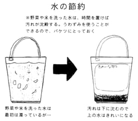 野菜を洗ったあとの水やお米をといだあとの水は、まだまだ利用できます。バケツに受けてとって置くと、食事が終るころには汚れが沈殿して、上澄みがきれいになってきます。この水を後片づけに利用します。