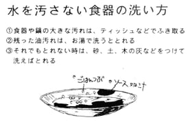 まず、できるかぎり洗剤を使わないことです。バケツにとっておいた水を沸騰させ、油で汚れた食器はこのお湯で流します。そのまえにティッシュなどで汚れをふき取っておけば、これで充分にきれいになります。