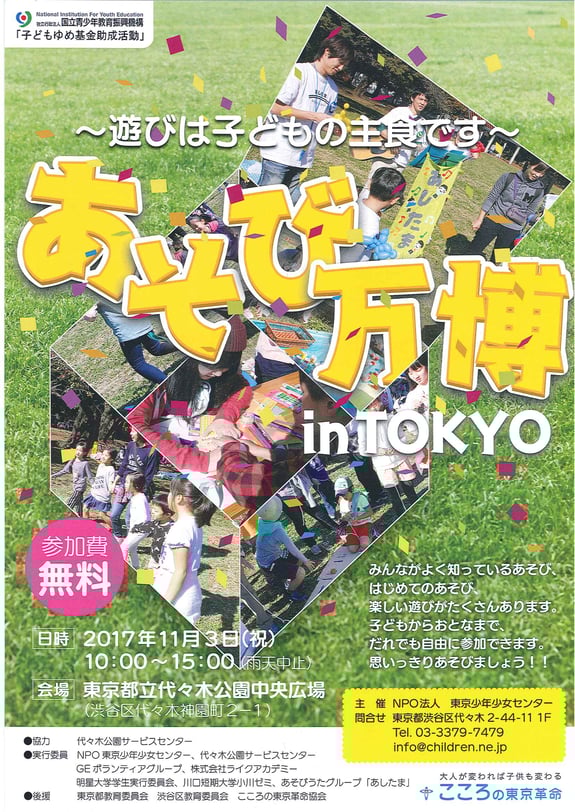 02日 11月 2017 あそび万博 第14回あそび万博in Tokyo 心配していた天気も晴れ予報になり、おもいっきりあそべる1日になりそうです。 参加費無料! 10時~15時の間はどの時間に来ても帰ってもOK! あそびと工作のブースは合わせて20以上! 大人も子どもも本気であそびまわっちゃいましょう。 10時~14時30の間でポイントスタンプラリーでビンゴを3つ作ると景品がもらえるよ♪(景品がなくなり次第終了です。) tagPlaceholderカテゴリ: コメントをお書きください コメント: 0